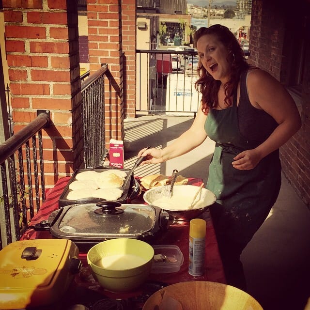 Amaris cooking up a pancake breakfast for the team, 539 Herald St